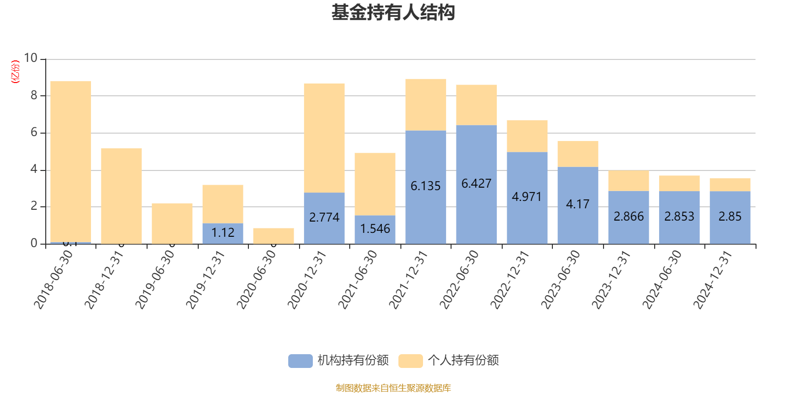 截至2024年12月31日,基金持有人共计6843户,合计持有3.55亿份。其中管理人员工持有22.6万份,占比0.06%,机构持有份额占比80.28%,个人投资者占比19.72%。